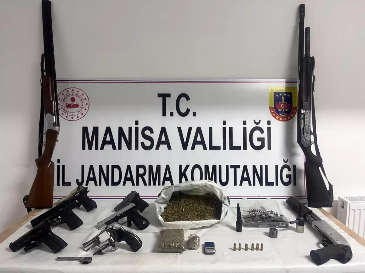 Soma'da jandarma, bir evde 6 ruhsatsız tabanca, 3 tüfek ve 970 gram uyuşturucu buldu.