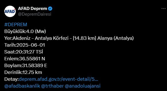 Afet ve Acil Durum Yönetimi Başkanlığı (AFAD) verilerine göre, Antalya Alanya ilçesi açıklarında 4.0 büyüklüğünde deprem meydana geldi.