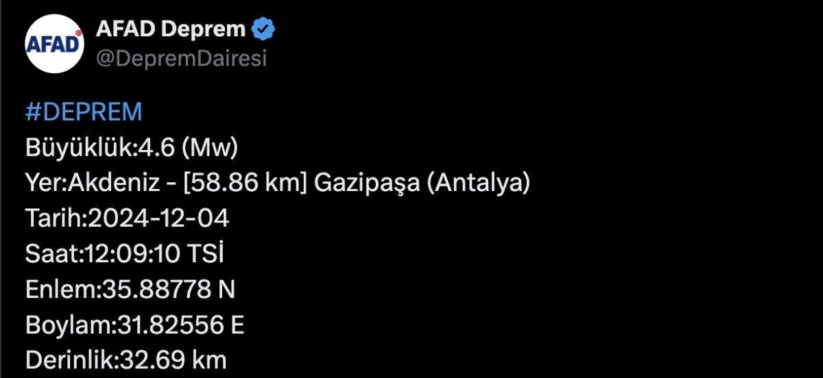 AFAD’a göre saat 12:09’da Antalya’nın Gazipaşa ilçesinde 4.6 büyüklüğünde bir deprem meydana geldi.