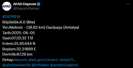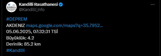 Kandilli Rasathanesi tarafından açıklanan son bilgilere göre ise deprem Akdeniz açıklarında 4.2 büyüklüğünde oldu. Depremin derinliği Kandilli tarafında 85 kilometre olarak ölçüldü.