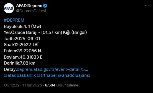 Bingöl’de meydana gelen depremin ardından bir açıklamada Kandilli Rasathanesi’nden geldi. Kandilli Rasathanesi depremin büyüklüğünü 4.5 olarak açıkladı. Depremin derinliği Kandilli tarafından 5 kilometre olarak açıklandı.