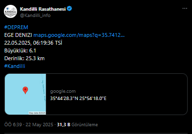 Kandilli Rasathanesi ise depremin boyutunu 6.1 olarak açıkladı. Rasathane’nin ölçümlerine göre depremin derinliği ise 25.3 km.