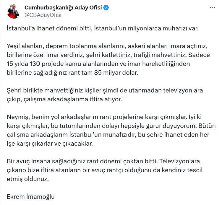 İmamoğlu, Cumhurbaşkanlığı Aday Ofisi’nden yaptığı açıklamada “İstanbul’a ihanet dönemi bitti, İstanbul’un milyonlarca muhafızı var. Yeşil alanları, deprem toplanma alanlarını, askeri alanları imara açtınız, birilerine özel imar verdiniz, şehri katlettiniz, trafiği mahvettiniz. Sadece 15 yılda 130 projede kamu alanlarından ve imar hareketliliğinden birilerine sağladığınız rant tam 85 milyar dolar.” dedi.