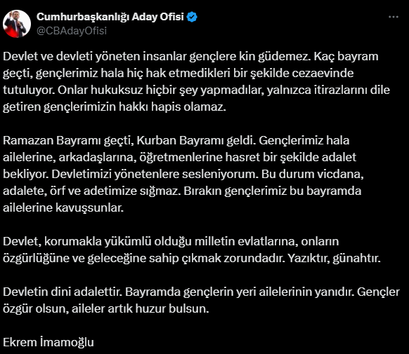 “Devlet ve devleti yöneten insanlar gençlere kin güdemez. Kaç bayram geçti, gençlerimiz hala hiç hak etmedikleri bir şekilde cezaevinde tutuluyor. Onlar hukuksuz hiçbir şey yapmadılar, yalnızca itirazlarını dile getiren gençlerimizin hakkı hapis olamaz. Ramazan Bayramı geçti, Kurban Bayramı geldi. Gençlerimiz hala ailelerine, arkadaşlarına, öğretmenlerine hasret bir şekilde adalet bekliyor. Devletimizi yönetenlere sesleniyorum. Bu durum vicdana, adalete, örf ve adetimize sığmaz. Bırakın gençlerimiz bu bayramda ailelerine kavuşsunlar. Devlet, korumakla yükümlü olduğu milletin evlatlarına, onların özgürlüğüne ve geleceğine sahip çıkmak zorundadır. Yazıktır, günahtır. Devletin dini adalettir. Bayramda gençlerin yeri ailelerinin yanıdır. Gençler özgür olsun, aileler artık huzur bulsun.”