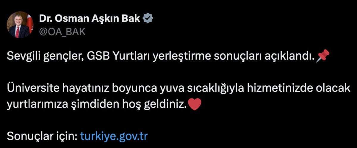 Son dakika haberine göre; Gençlik ve Spor Bakanı Osman Aşkın Bak, GSB Yurt başvuru sonuçlarının açıklandığını duyurdu.