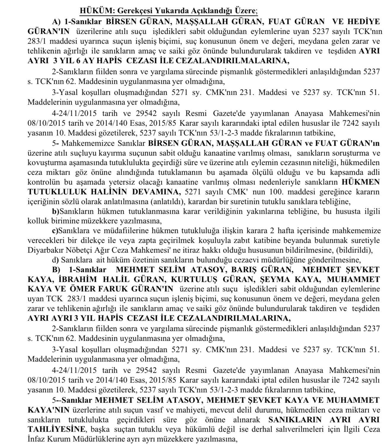 Mehmet Selim Atasoy, Muhammed Kaya ve Mehmet Şevket Kaya için tahliye kararı verilirken, Fuat Güran, Birsen Güran ve Maşallah Güran’a 3 yıl 6 ay hapis cezası verilerek tutukluluk hallerinin devamına karar verildi. Suça sürüklenen 3 çocuk ve 6 sanık hakkında ise 3’er yıl hapis cezası verildi.
