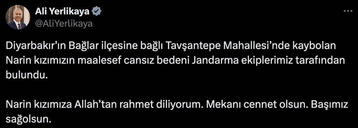 Diyarbakır’ın Bağlar ilçesine bağlı Tavşantepe Mahallesi’nde kaybolan Narin kızımızın maalesef cansız bedeni Jandarma ekiplerimiz tarafından bulundu.