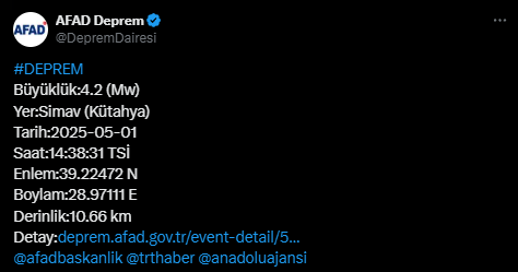 Kütahya Simav da yine bir deprem meydana geldi. Simav merkezli deprem 14.38’de oldu. Yerin 10 kilometre derinliğinde meydana gelen depremin büyüklüğü AFAD tarafından 4.2 olarak ölçüldü.