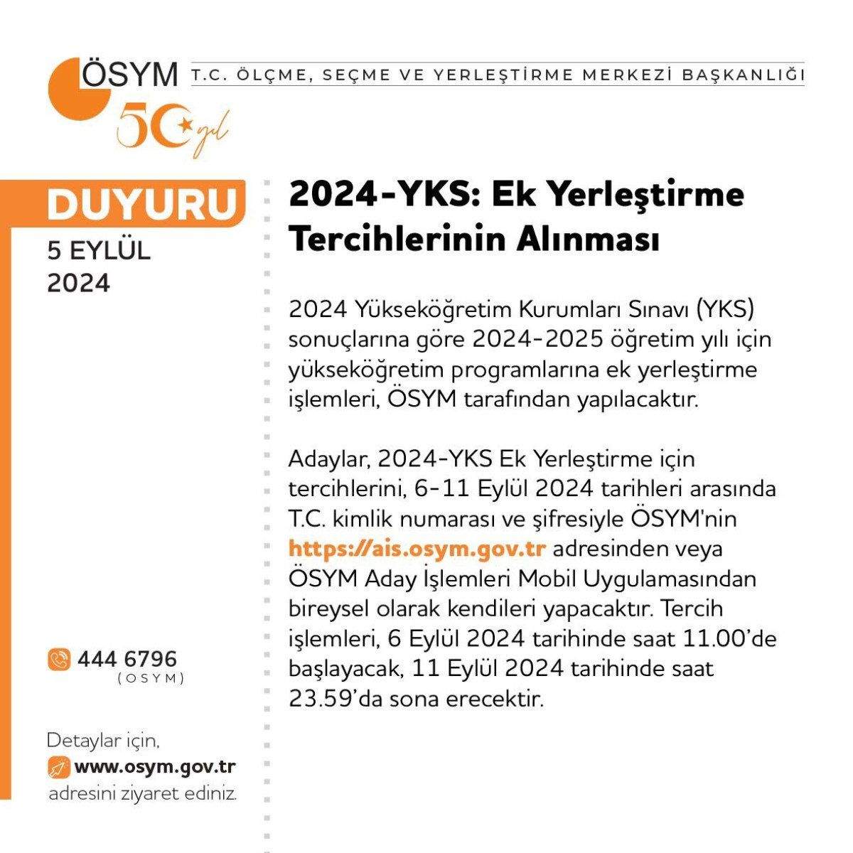 Adaylar, 2024-YKS Ek Yerleştirme için tercihlerini , 6-11 Eylül 2024 tarihleri arasında T.C. kimlik numarası ve şifresiyle ÖSYM’nin adresinden veya ÖSYM Aday İşlemleri Mobil Uygulamasından bireysel olarak kendileri yapacak.