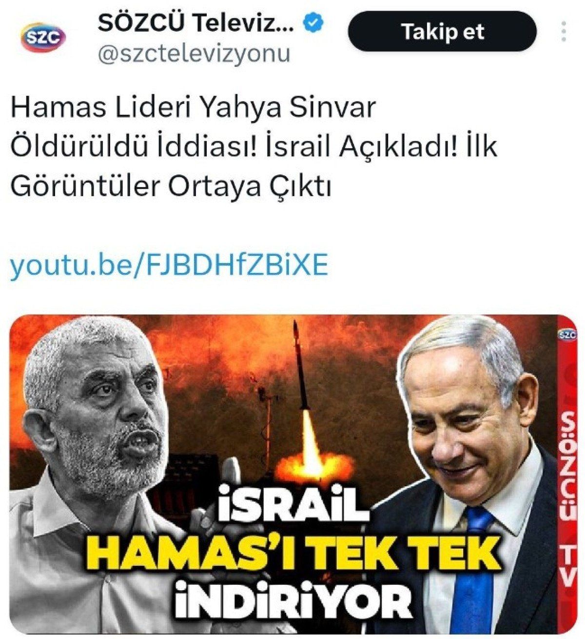 Sözcü TV’nin söz konusu manşetinde “İsrail Hamas’ı tek tek indiriyor” ifadeleri kullanıldı.