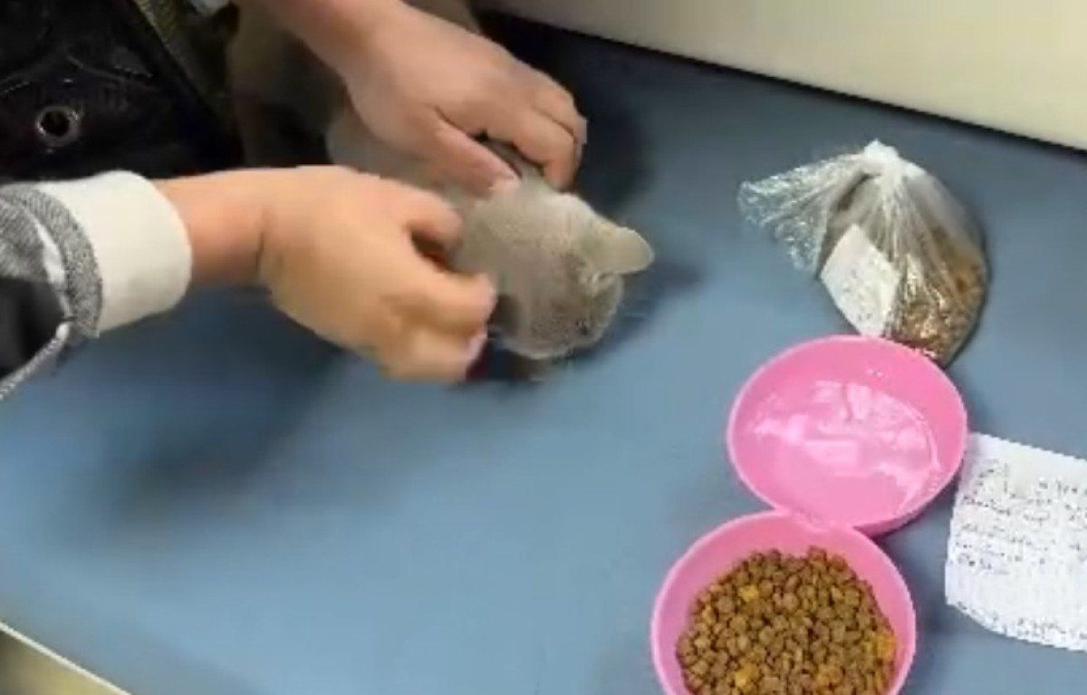 İstanbul Sultanbeyli’de, bir kadın ofisin önüne çantasının içinde terkedilmiş yavru bir kedi bıraktı.