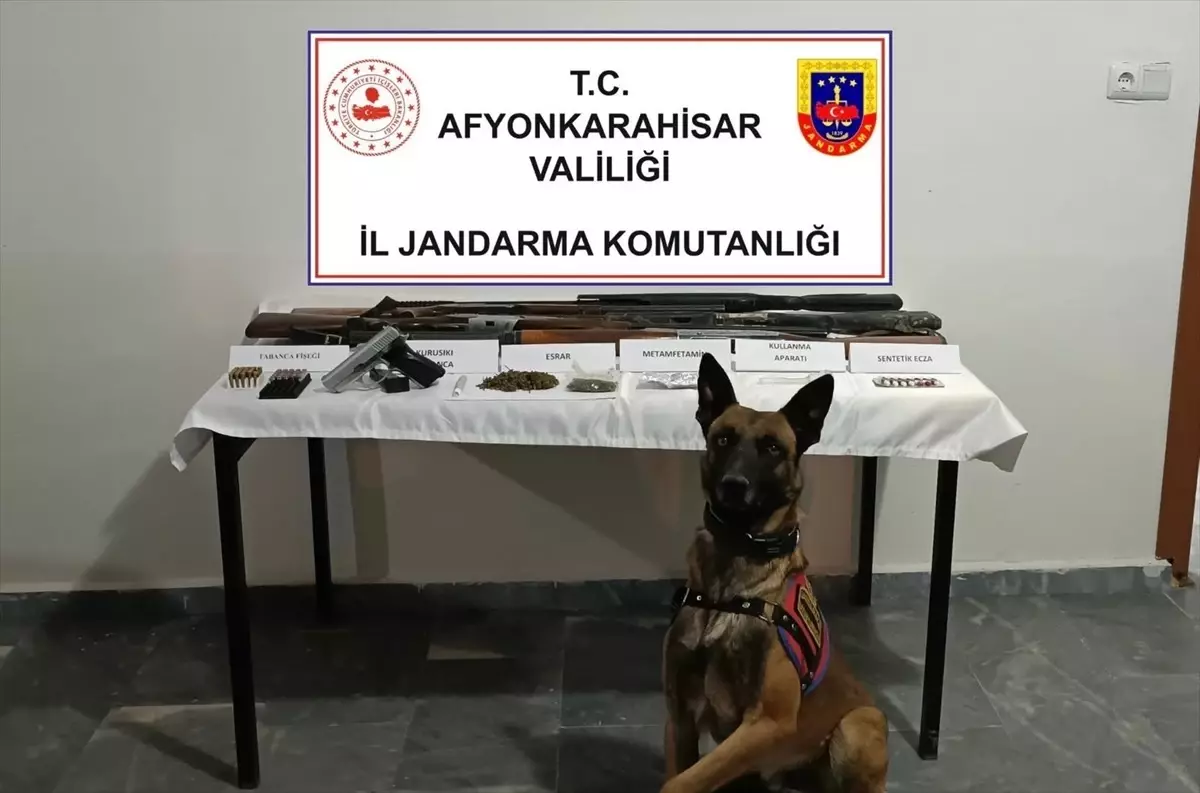 Ekipler, belirlenen araçta, “dedektör köpek”le yaptığı aramada bir miktar uyuşturucu, 14 sentetik hap, uyuşturucu kullanma aparatı, 4 ruhsatsız av tüfeği, kuru sıkı tabanca ile 49 fişek ele geçirdi.