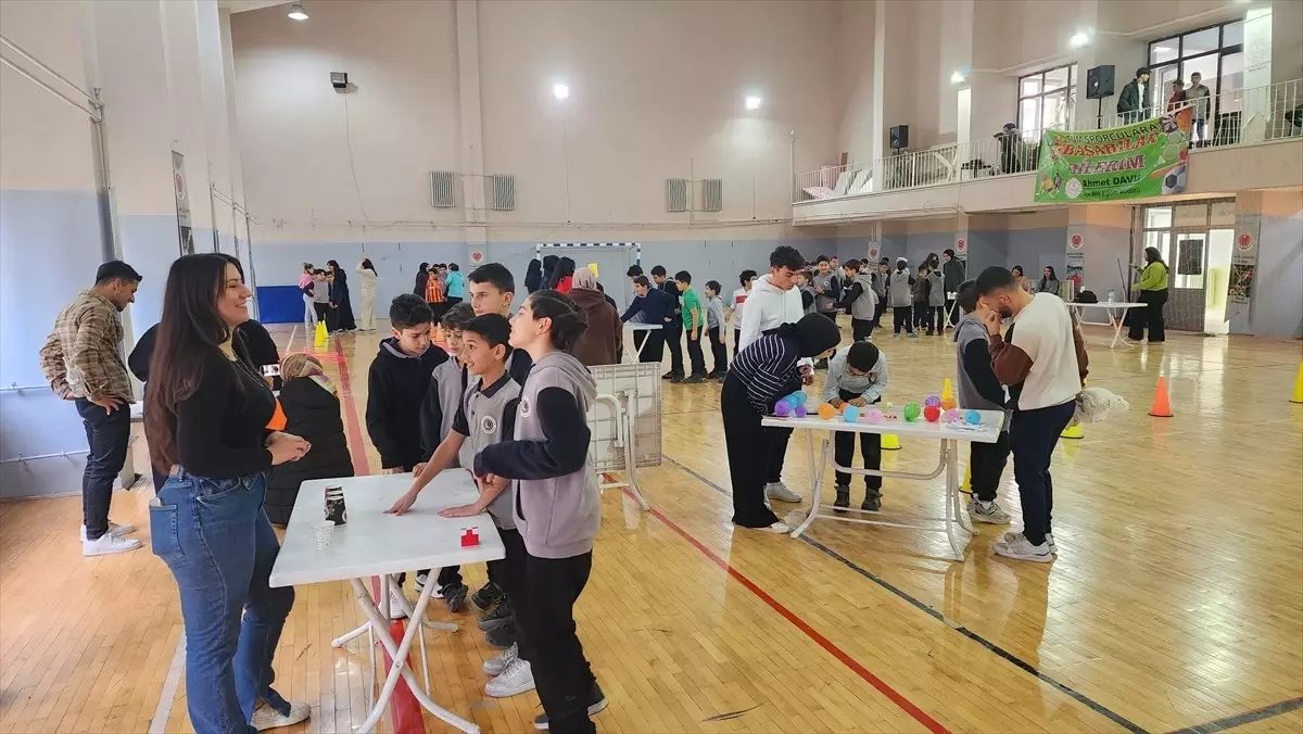 Okulun spor salonunda düzenlenen etkinlikte üniversite ile ortaokul öğrencileri, spor salonunda oluşturulan altı parkurda eğlenceli matematik oyunları oynadı.