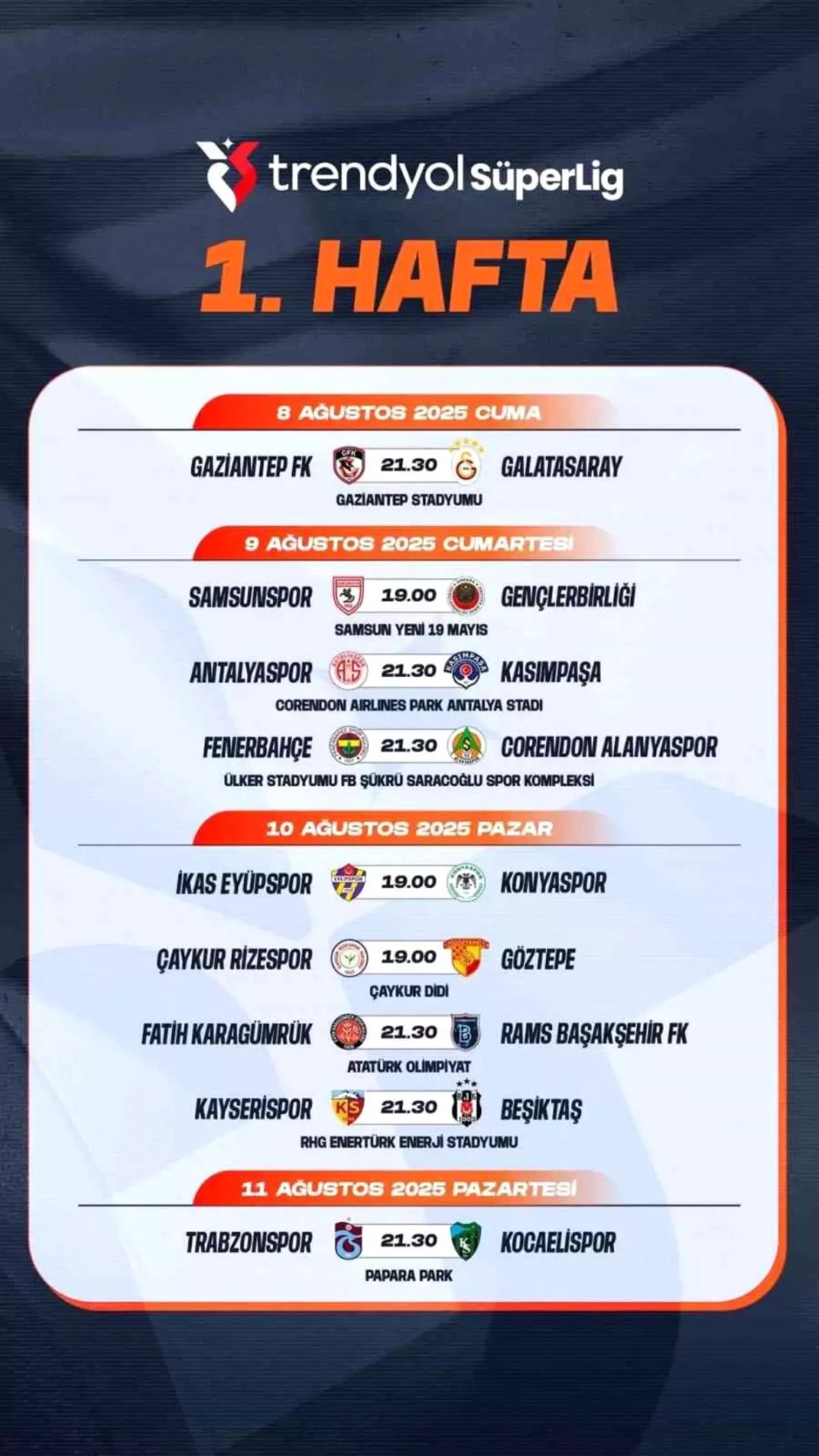 Süper Lig’de 1 ve 2. haftanın programı şu şekilde: