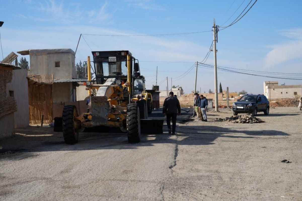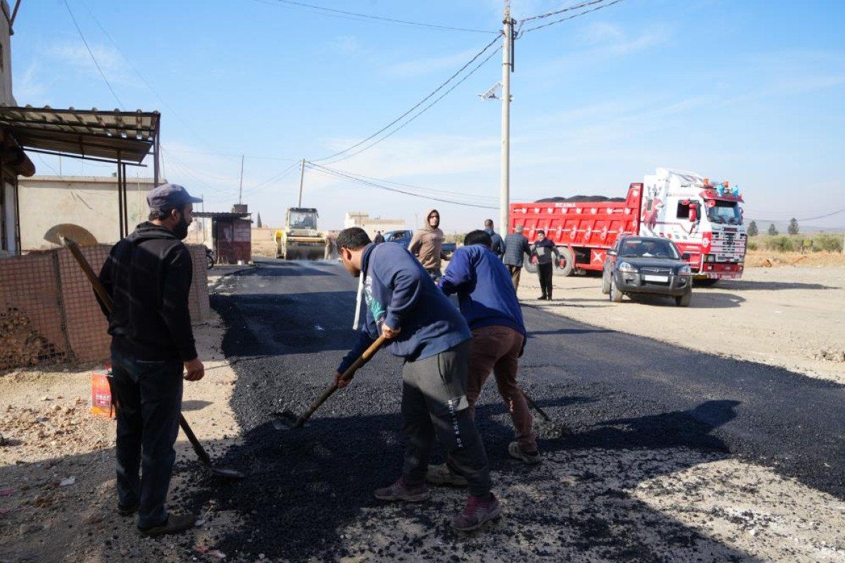 Çobanbey Belediyesine ait iş makineleri, Fırat Kalkanı bölgesinden Münbiç’e giden ara yollarda onarım çalışmalarının ardından asfalt dökmeye başladı.