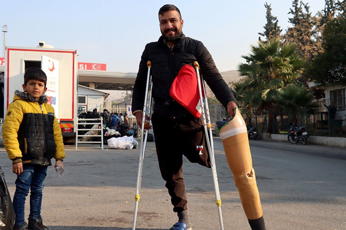 Koltuk değnekleriyle ilerleyen baba Muhammed Talha, eşiyle geldiği Türkiye’den 11 yıl sonra eşi, bir çocuğu ve bir bacağı olmadan ülkesine döndüğünü söyledi.