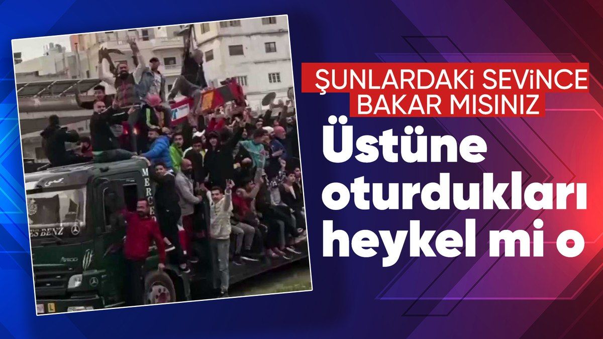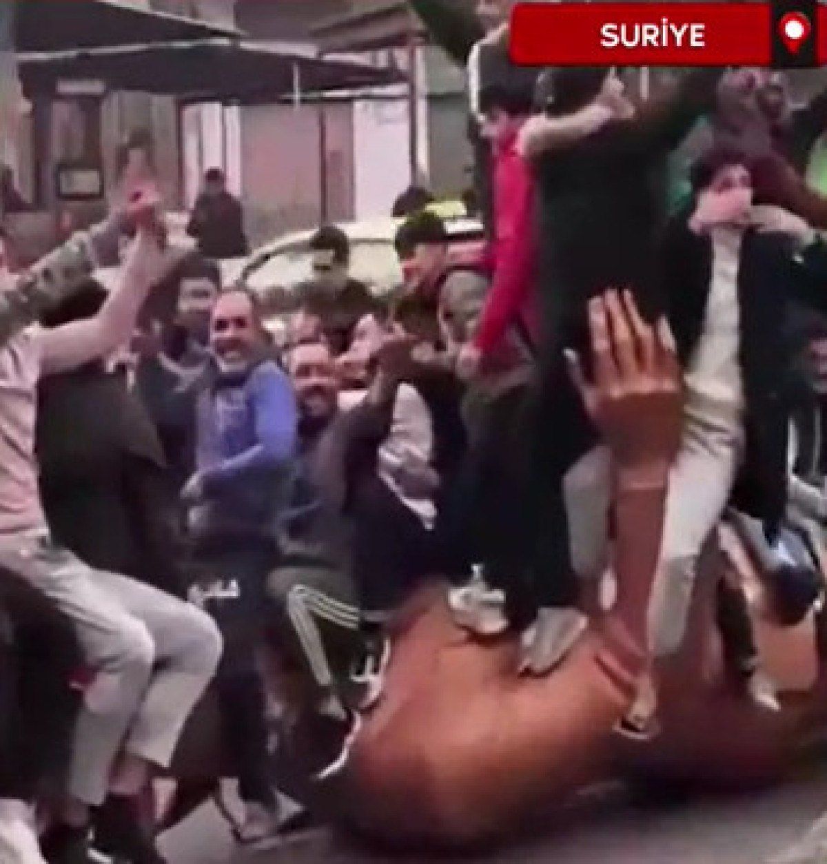 HTŞ ve rejim karşıtı grupların Şam'da zafer kazanmasının ardından birçok yerde bulunan Esed heykeli halk tarafından yıkıldı. Yine Suriye'de devrilen Esed heykelinin üzerinde eğlenen halkın o anları kameraya yansıdı.