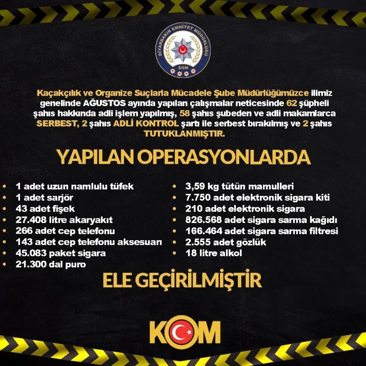 Ağustos'ta yapılan operasyonlarda 62 şüpheli yakalandı, 2'si tutuklandı, çeşitli kaçak mallar ele geçirildi.