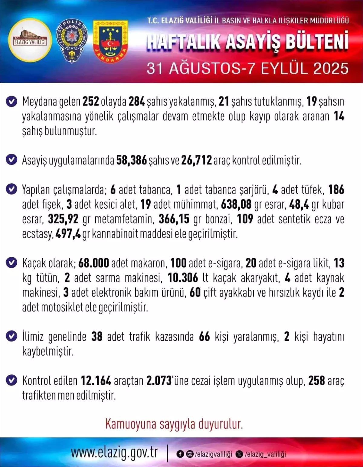 Elazığ'da geçen hafta 252 asayiş olayı yaşandı, 284 şüpheli yakalanıp 21 kişi tutuklandı.