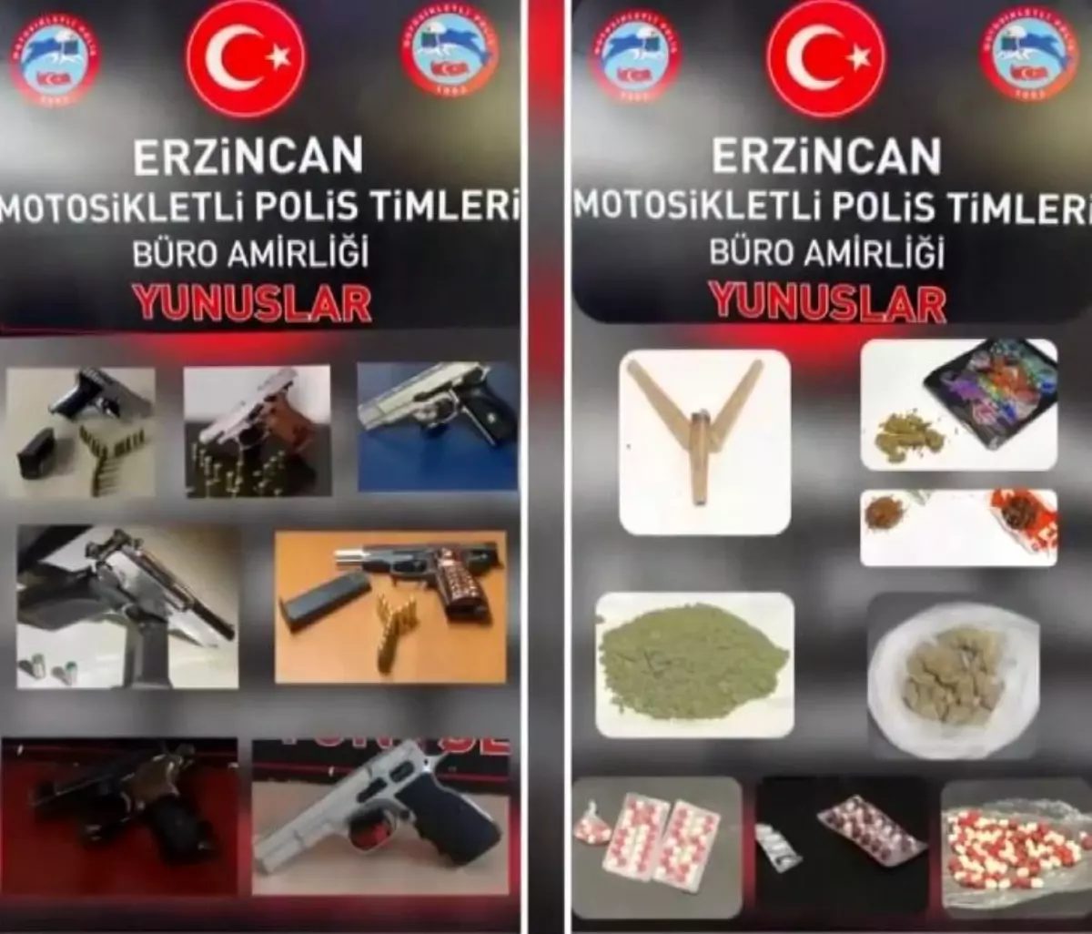 Erzincan'da yapılan operasyonda ruhsatsız tabanca, uyuşturucu madde ve tarihi eser ele geçirildi.