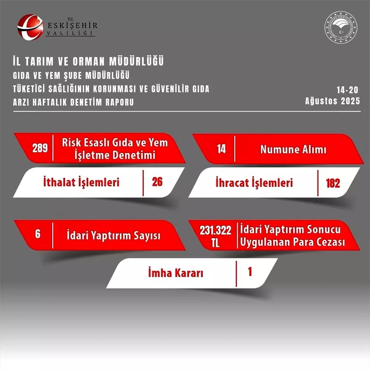 Ağustos ayında Eskişehir'de gıda güvenliğini ihlal eden işletmelere toplam 231 bin 322 TL ceza kesildi.