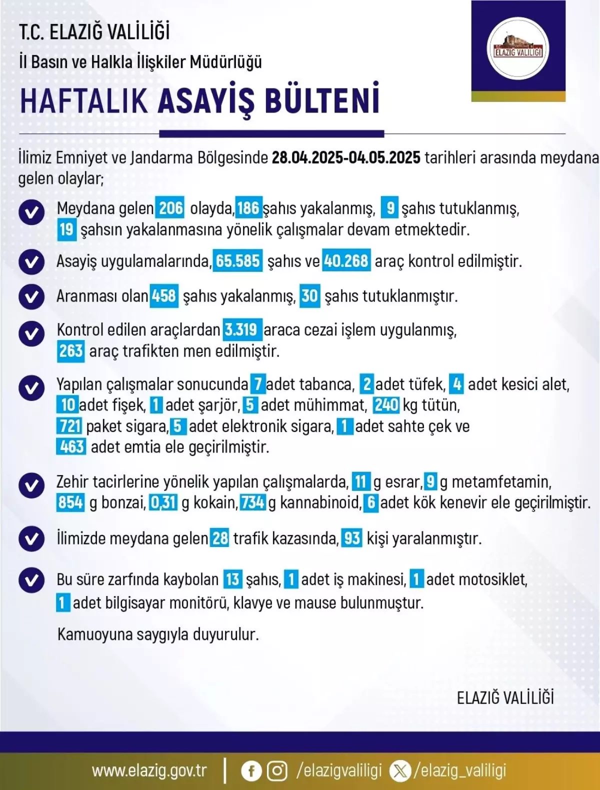 Elazığ'da son haftada 206 asayiş olayı meydana geldi, 186 şahıs yakalandı, 9'u tutuklandı.