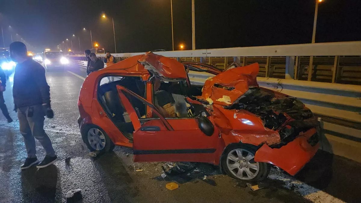 Anadolu Otoyolu'ndaki kazada bir otomobil TIR'a çarpıp bariyerlere devrildi, 4 kişi yaralandı.