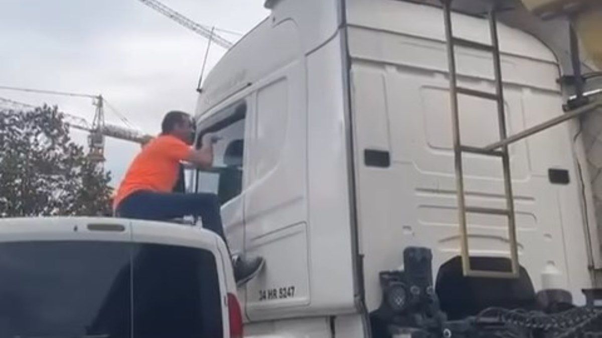 Zeytinburnu'nda bir sürücünün, tartıştığı tır şoförünün camına yetişmek için, tırın üstüne çıktığı anlar kameraya yansıdı.
