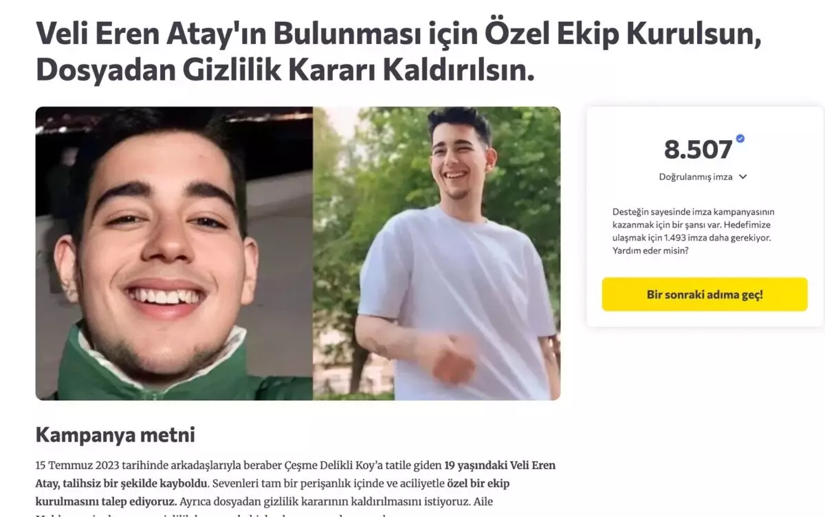 Çeşme'de kaybolan Veli Eren Atay için ailesi imza kampanyası başlattı. Umutla aranıyor.