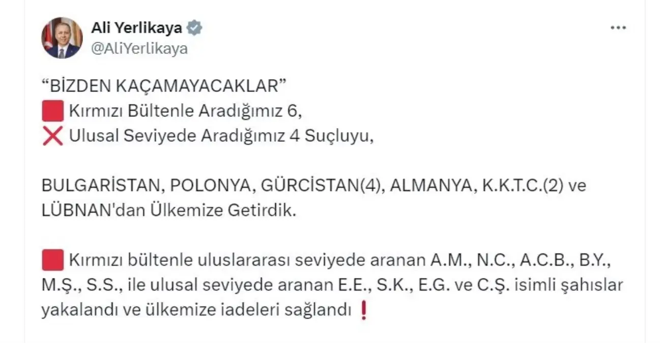 Bakan Yerlikaya, uluslararası ve ulusal seviyede kırmızı bültenle aranan 10 şahsın yakalandığını duyurdu.