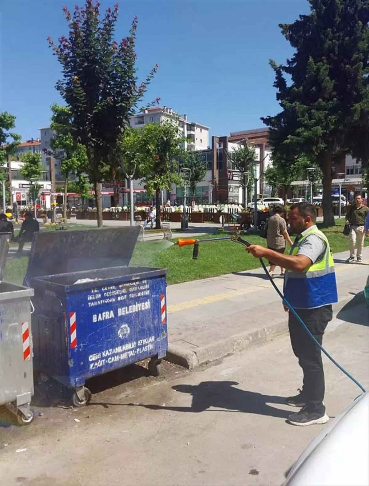 Bafra Belediyesi, yaz aylarında kötü koku ve haşere oluşumunu önlemek için çöp konteynerlerini dezenfekte ediyor.
