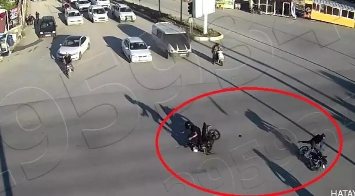 Hatay'ın Antakya ilçesinde 2 motosikletin kavşakta çarpıştığı ve sürücülerin yola savruldukları anlar kameraya yansıdı. Kazada yaralanan sürücülerin durumu ise belirsiz.