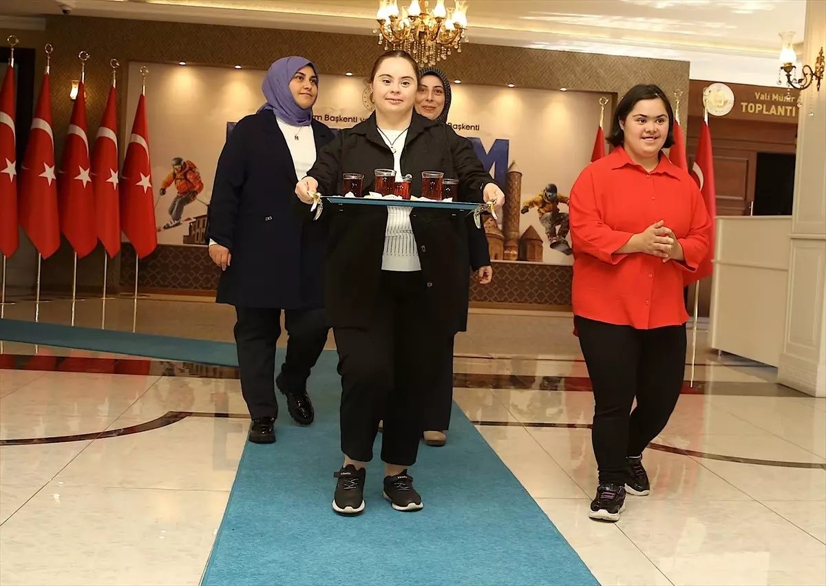 Erzurum'daki valilikte, Down sendromlu Çağla ve Elif, güler yüzleriyle çalışma ortamına neşe kattı.