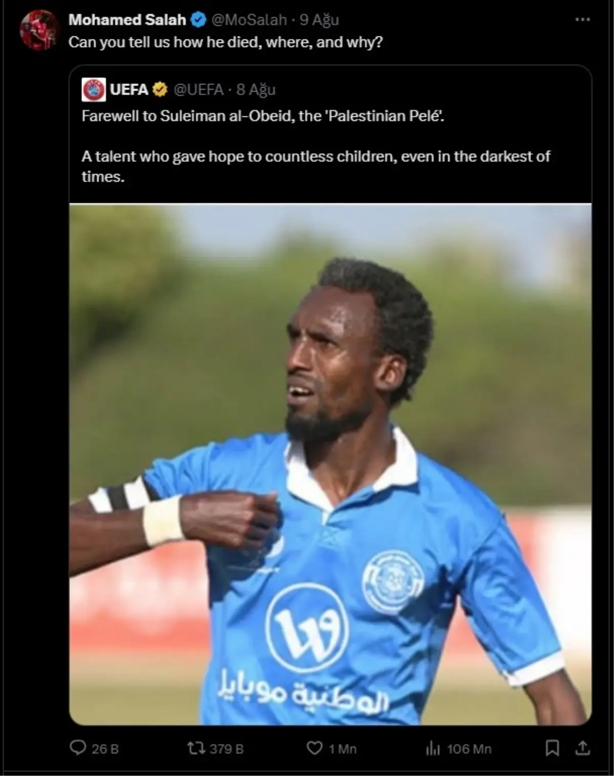 Mohammed Salah, Süleyman el-Ubeyd'in ölümü sonrası UEFA'nın paylaşımına eleştiride bulundu.