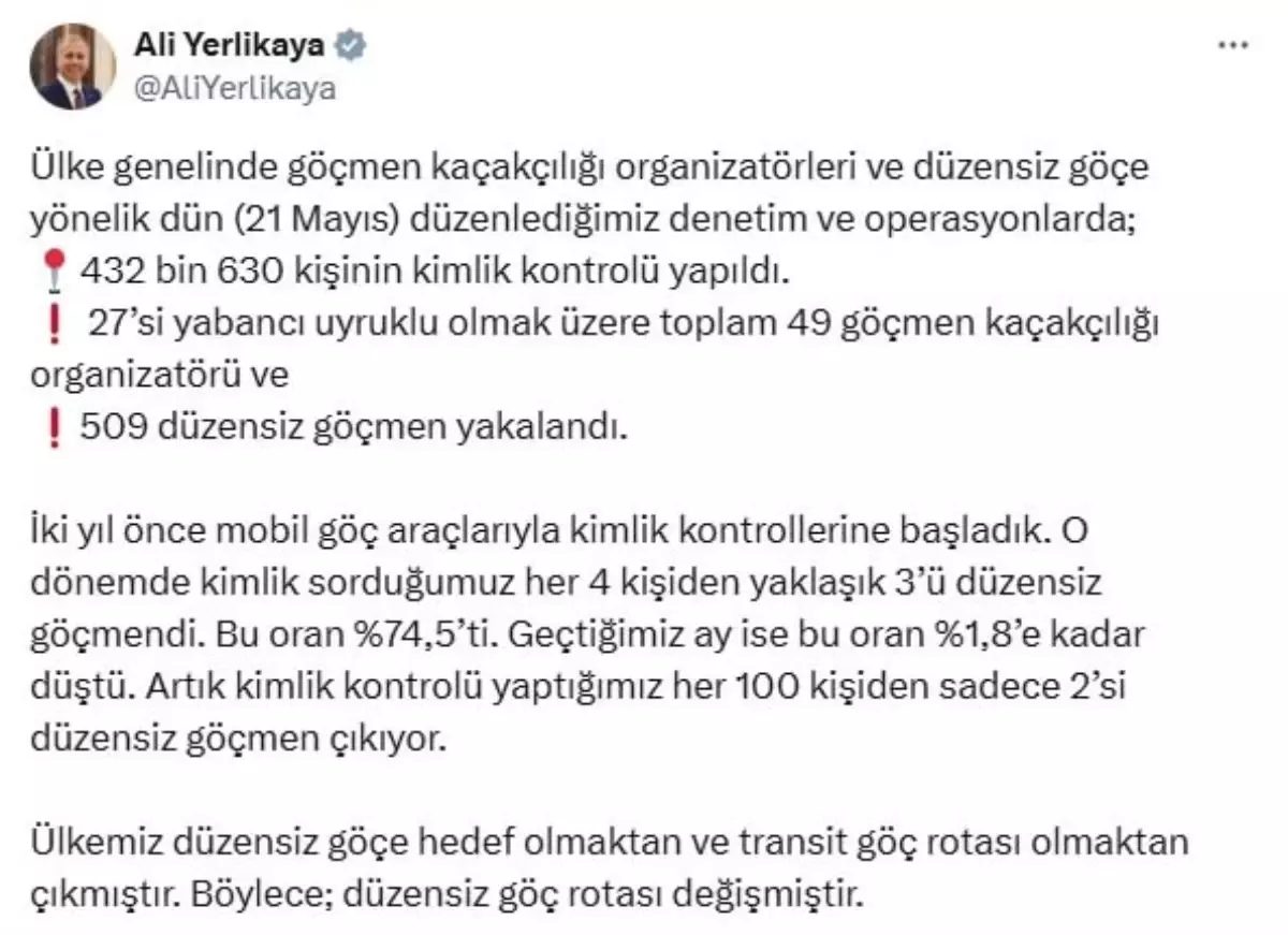 İçişleri Bakanı Yerlikaya, düzenlenen operasyonlarda 49 göçmen kaçakçısı ve 509 düzensiz göçmen yakalandı.