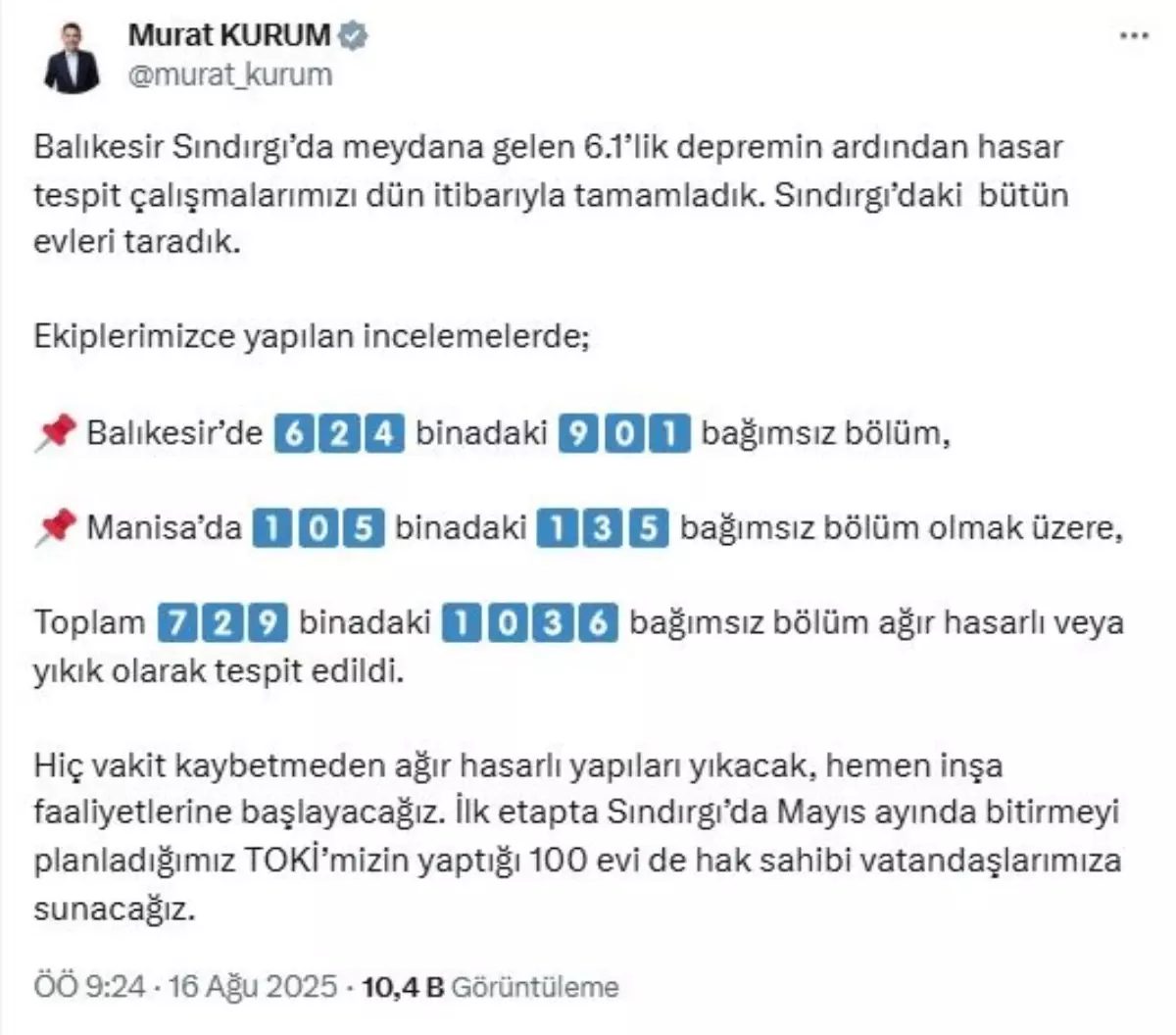 Çevre, Şehircilik ve İklim Değişikliği Bakanı Murat Kurum, Balıkesir Sındırgı'da meydana gelen 6.1 büyüklüğündeki depremin ardından hasar tespit çalışmalarının sonuçlarını paylaştı. Bakan Kurum, "Balıkesir ve Manisa'da toplam 729 binadaki bin 36 bağımsız bölüm ağır hasarlı veya yıkık olarak tespit edildi" dedi.