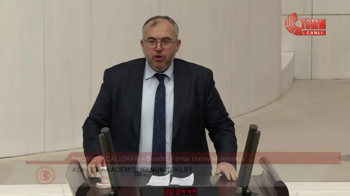 TBMM Genel Kurulu'nda, Adalet Akademisi Kanun Teklifi görüşmeleri başladı. Saadet Partisi Hatay Milletvekili Necmettin Çalışkan, "Ülkemizde en vahim tabloların yaşandığı alan adalettir. İktidar bu noktada adil; kendinden olmayan herkese eşit derecede zulmediyor. Zulümde adil davranıyor" dedi. CHP Aydın Milletvekili Süleyman Bülbül ise "AKP iktidarı ilk seçimde gidecek ve kayyumlar iktidarı olarak anılacak" ifadelerini kullandı.