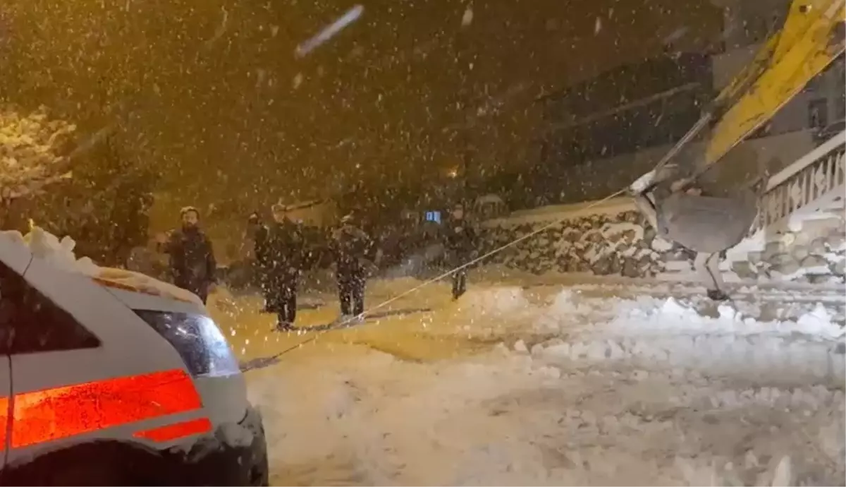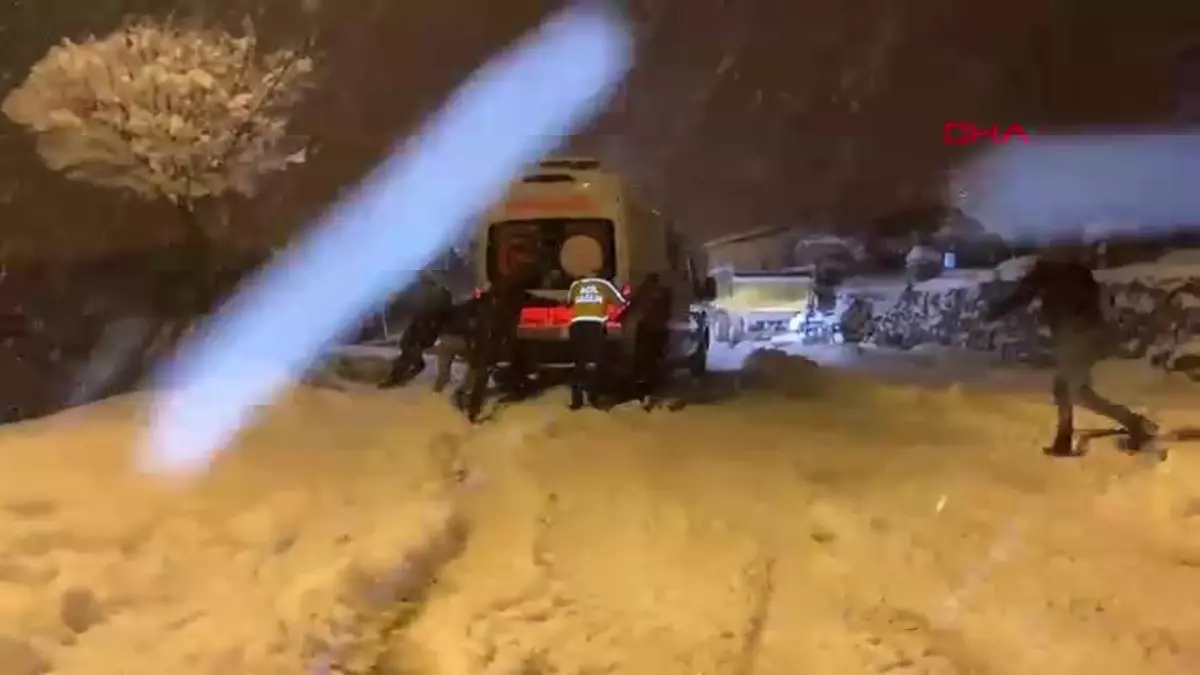 BARBURT'ta etkili olan kar yağışı sonrası ambulans, hasta bırakırken buzlanan yolda saplandı. İş makinesiyle kurtarılan ambulans, hastasını teslim etmek için yola devam etti.