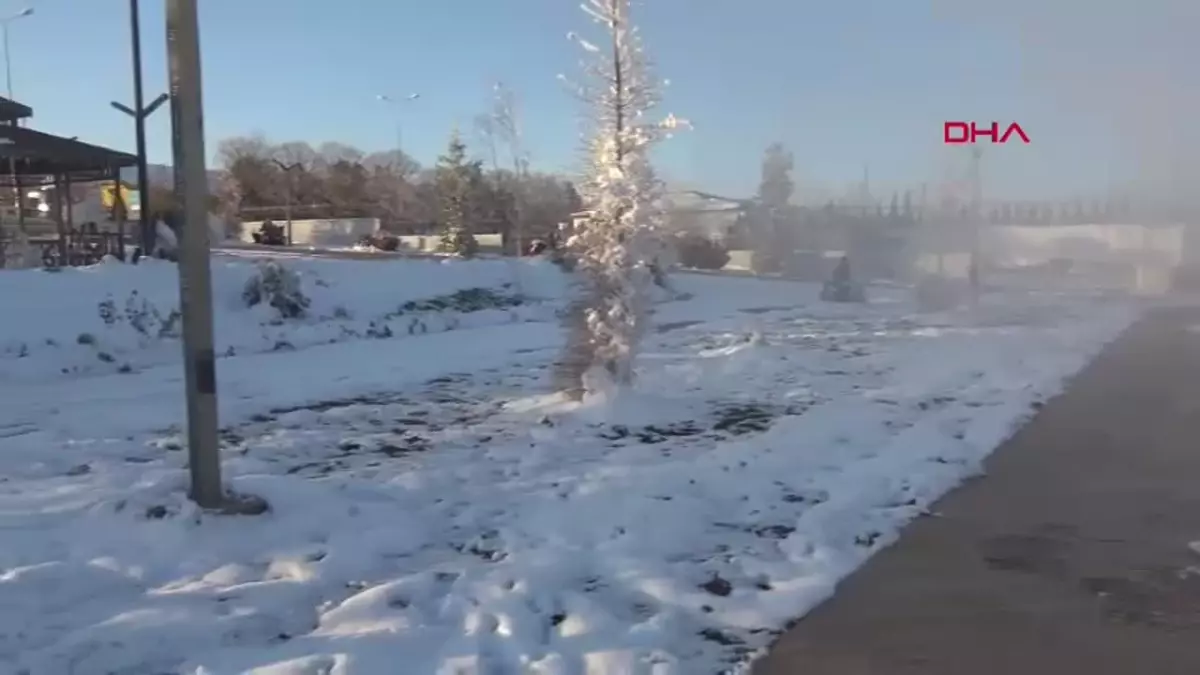 Sivas'taki Sıcak Çermik Kaplıcası'na bağlı Altınkale, karla kaplandığı kış mevsiminde sıcak suyun buharıyla göz dolduruyor. 45 derecelik suyun soğuk hava ile birleşimi, eşsiz bir manzara ortaya çıkarıyor.