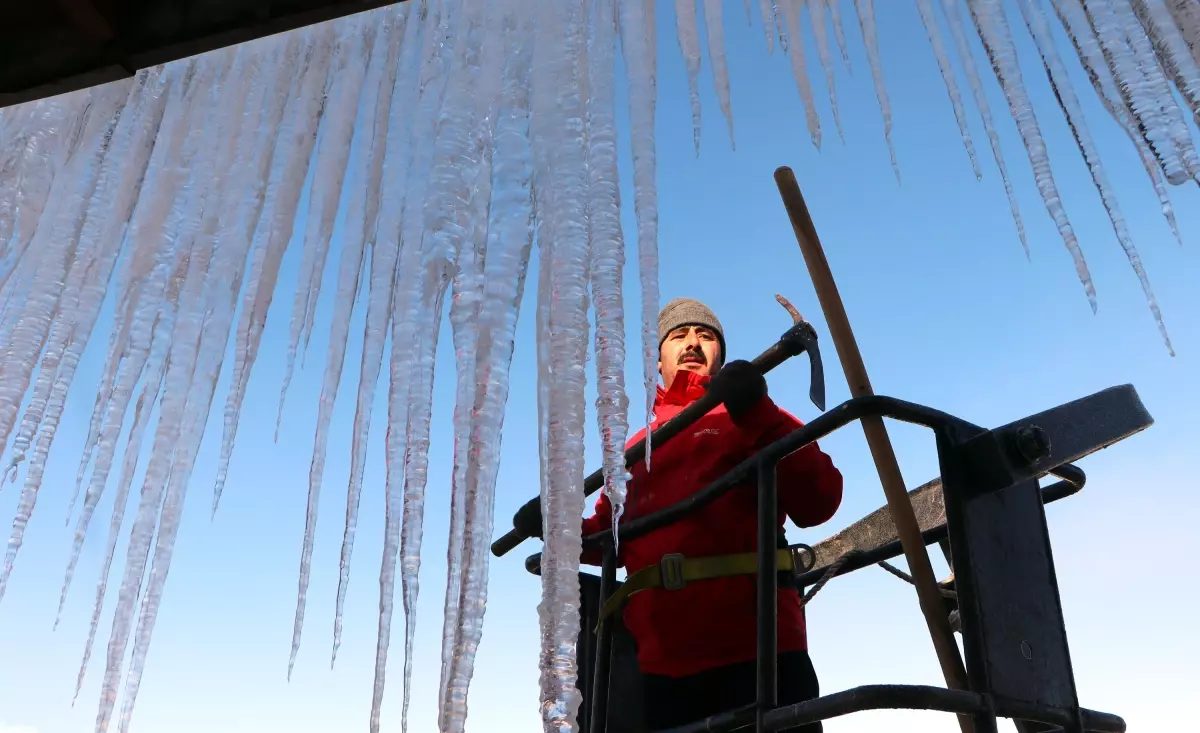 Yoğun kar yağışı sonrası Erzurum'da çatılarda oluşan kar kütleleri ve buz sarkıtları, Büyükşehir Belediyesi'nin buz kırma ekibi tarafından temizleniyor. Ekip, güvenliğin sağlanması için özellikle yoğun trafiğin bulunduğu yerlerde çalışmalarını sürdürüyor.
