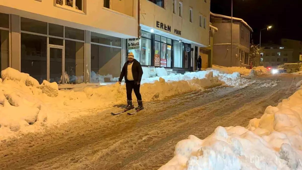 Bayburt'ta kar kalınlığı 80 cm'yi bulurken, İhsan Kocabey cadde üzerinde kayak yaparak dikkat çekti.