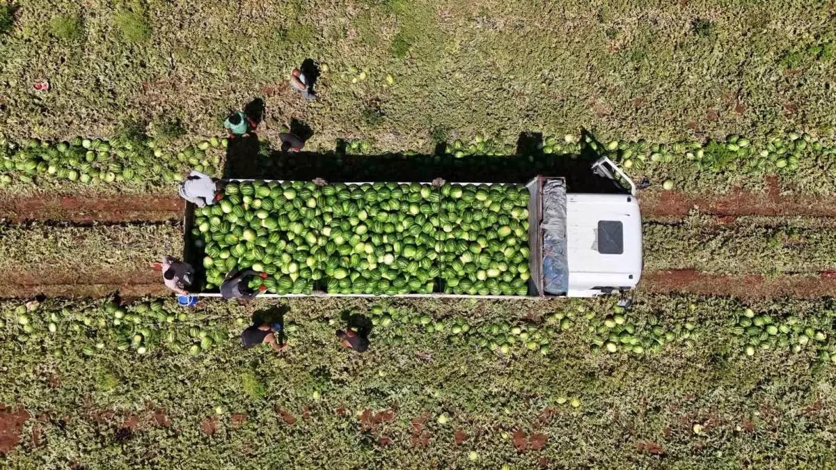 Diyarbakır karpuzu hasadında sıcak hava nedeniyle fiyatlar düştü; artık kilo 1-2 TL'den satılıyor.