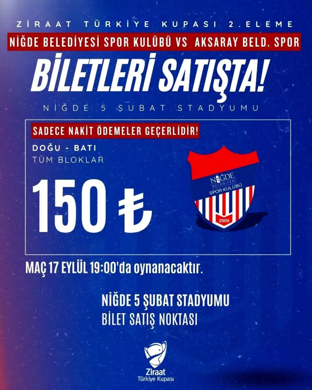 Niğde Belediyespor Kulübü, Ziraat Türkiye Kupası 2. Eleme Turu'nda 17 Eylül tarihinde Aksaray Belediye Spor ile mücadele edecek. Maç, Niğde 5 Şubat Stadyumu'nda saat 19.00'da başlayacak.