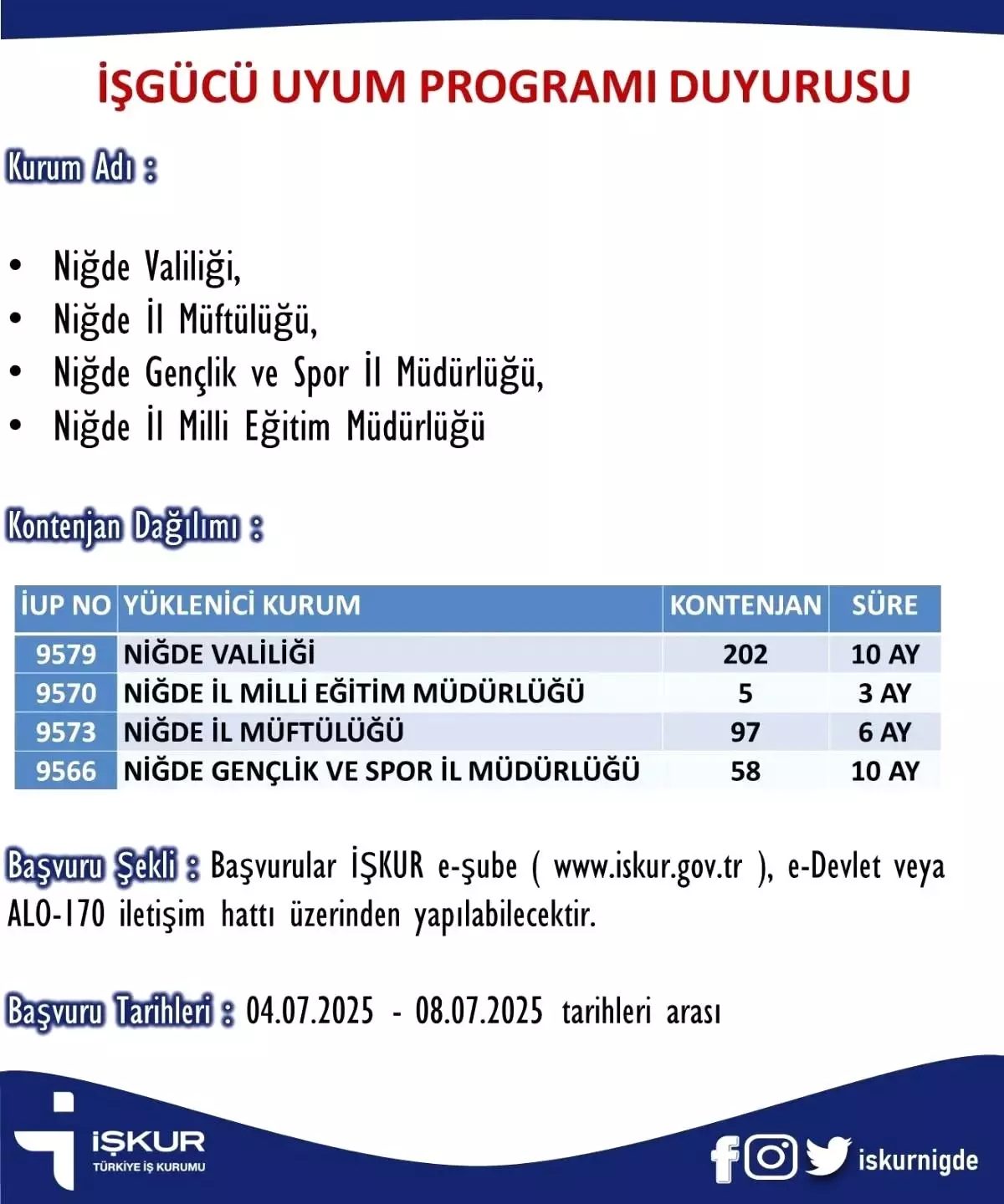 İŞKUR, Niğde'de kamu kurumlarına 362 geçici iş için başvuruları 4-8 Temmuz 2025'te alıyor.