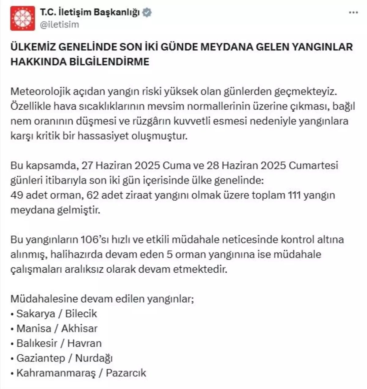 Son iki günde 111 yangın çıktı, 106'sı kontrol altına alındı. 5 yangına müdahale devam ediyor.