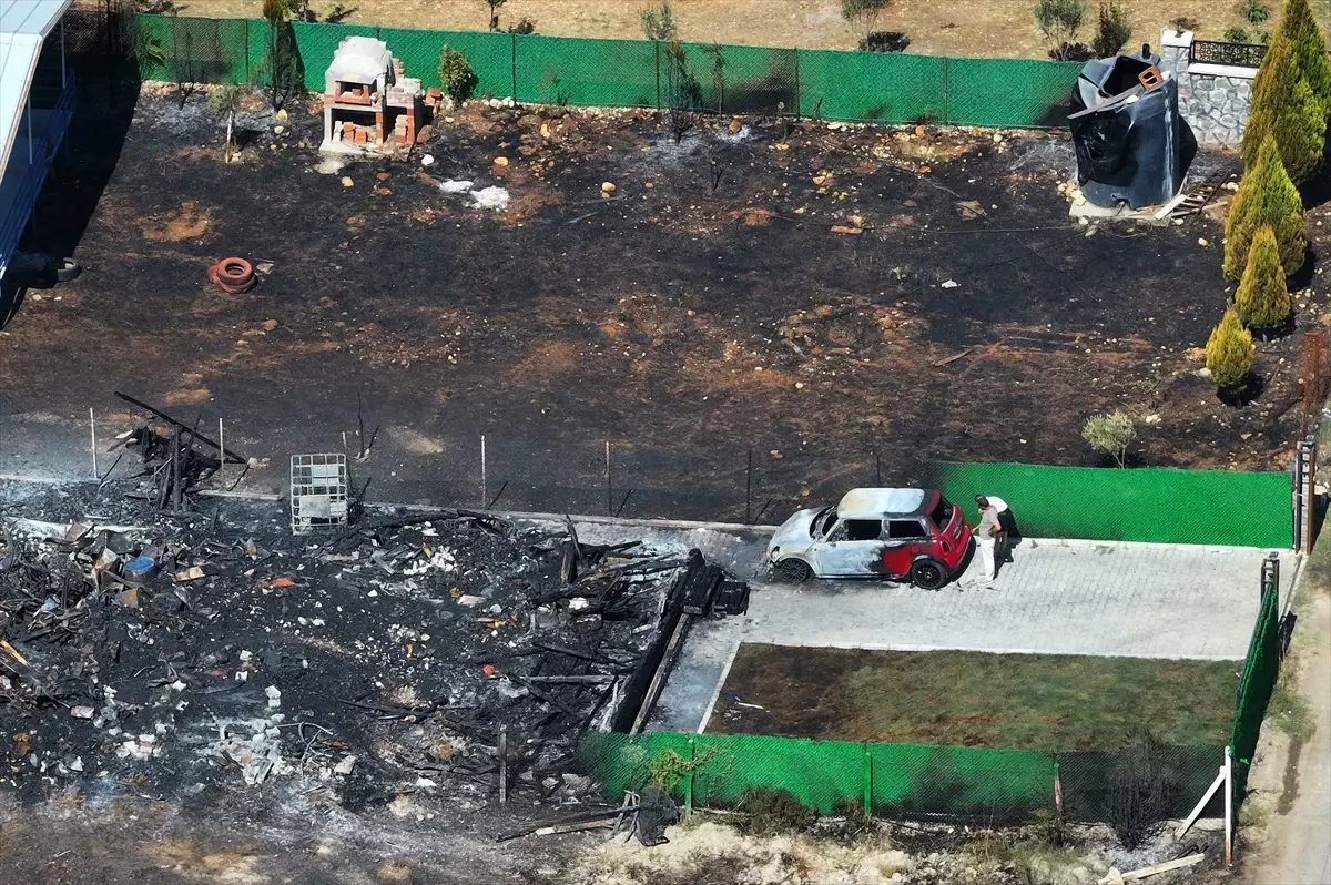 Bornova'daki yangında evler zarar gördü, dronla görüntülenen alan siyaha bürüldü. Yangın kontrol altına alındı.