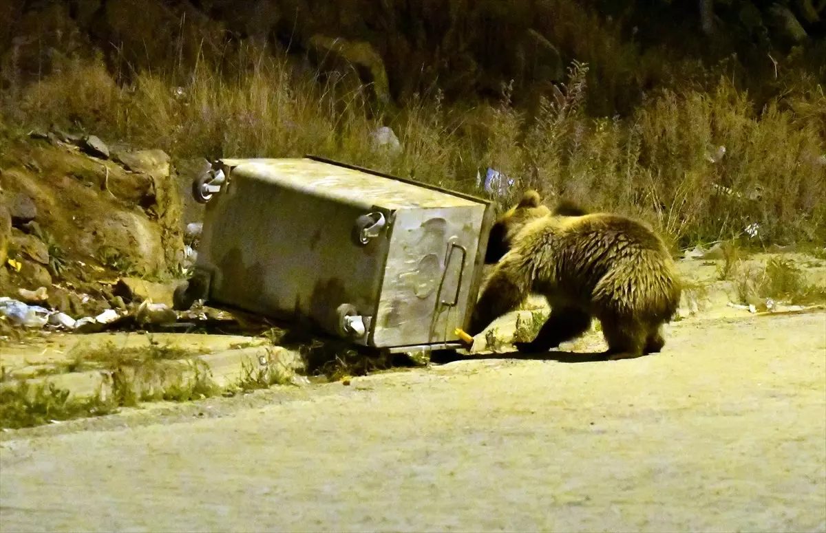 Sarıkamış'taki bozayılar, soğuk havada yiyecek bulmak için çöp konteynerlerine inmeye başladı.