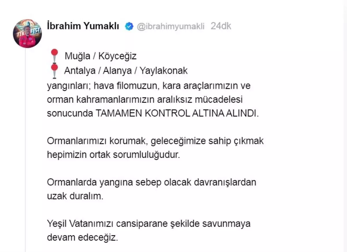 Tarım ve Orman Bakanı Yumaklı, Muğla ve Antalya'daki orman yangınlarının tamamen kontrol altına alındığını açıkladı.