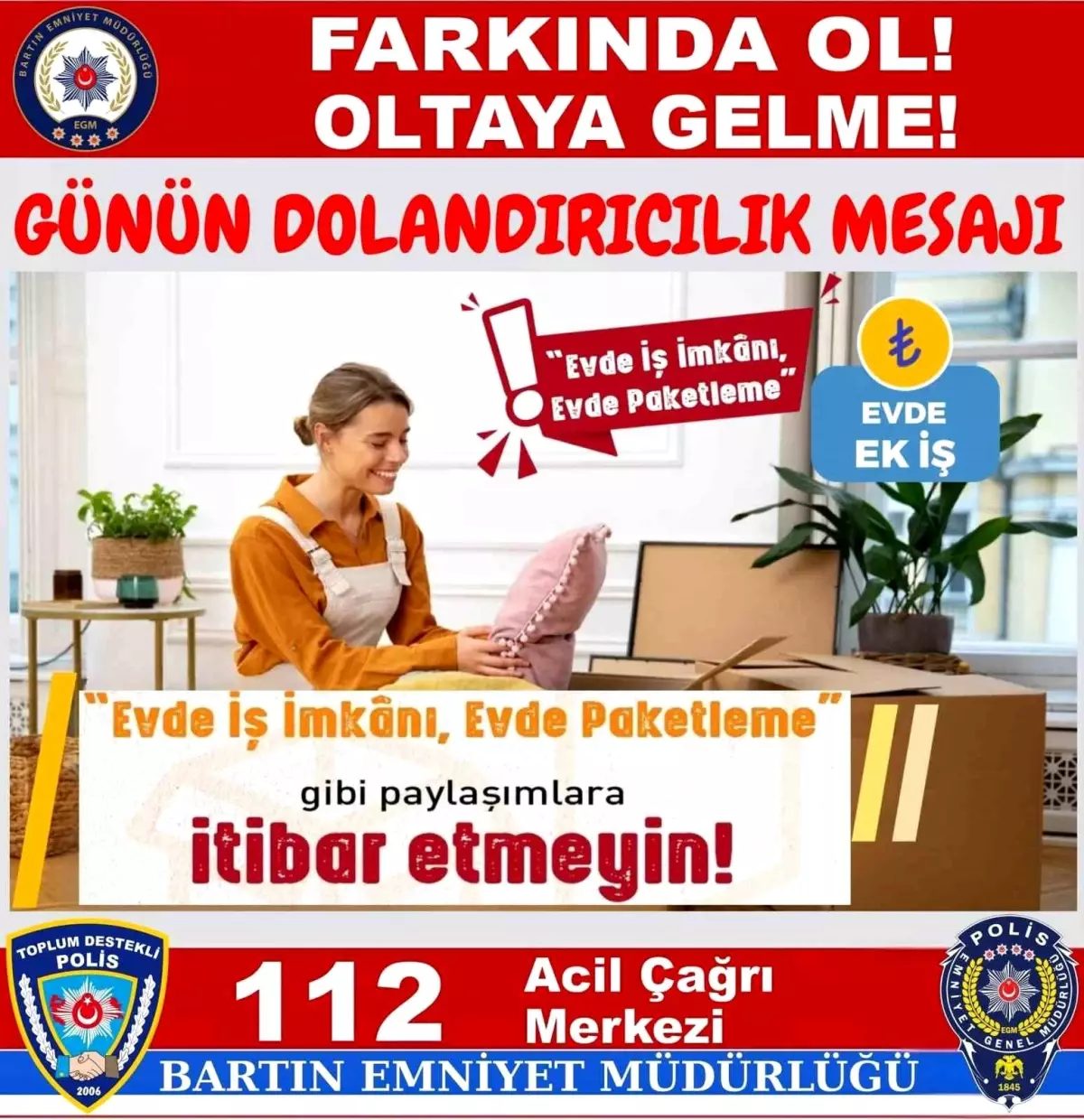 Bartın Emniyet Müdürlüğü, evden paketleme işleri için dolandırıcılık uyarısında bulundu.