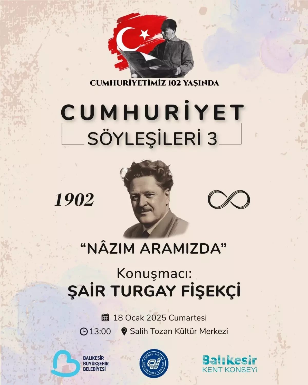 Balıkesir Büyükşehir Belediyesi'nin düzenlediği Cumhuriyet Söyleşileri serisinin üçüncü programında şair Turgay Fişekçi, 'Nazım Aramızda' başlıklı söyleşisini gerçekleştirecek. Etkinlik, 18 Ocak'ta Salih Tozan Kültür Merkezi'nde edebiyat severlerle buluşacak.